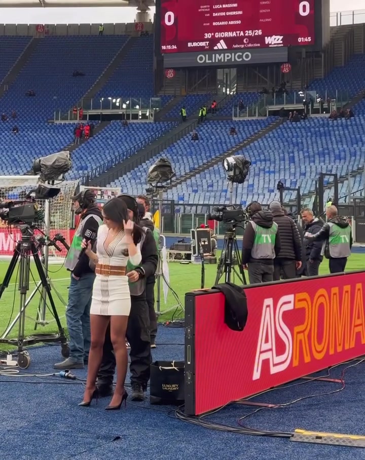 意甲第30轮,罗马主场作战 1-0击败莱切,26岁的DAZN美女主持Giusy Meloni现场报道本场赛事 。赛后她更新社媒,晒出在罗马奥林匹克运动活动 场 射门的视频。