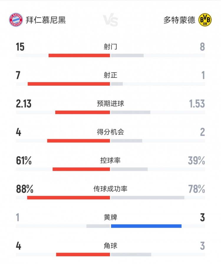 拜仁2-1多特数据:射球 15-8,射正7-1,积分 机会4-2,底线球4-3