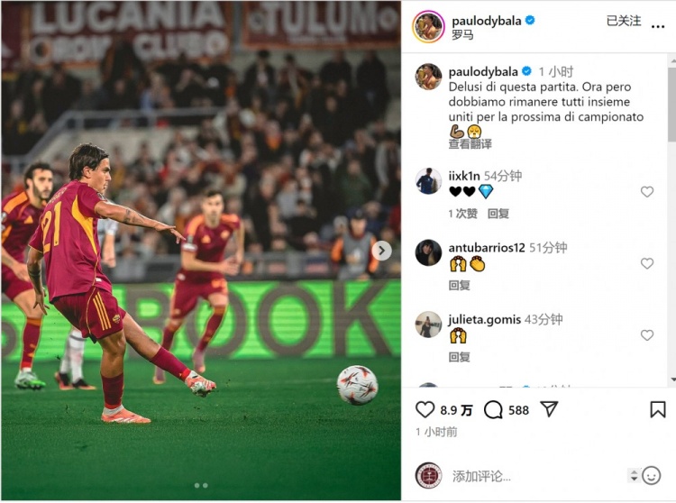 欧联杯失利!迪巴拉:对比赛感到失望,此刻要团结一致备战下一场