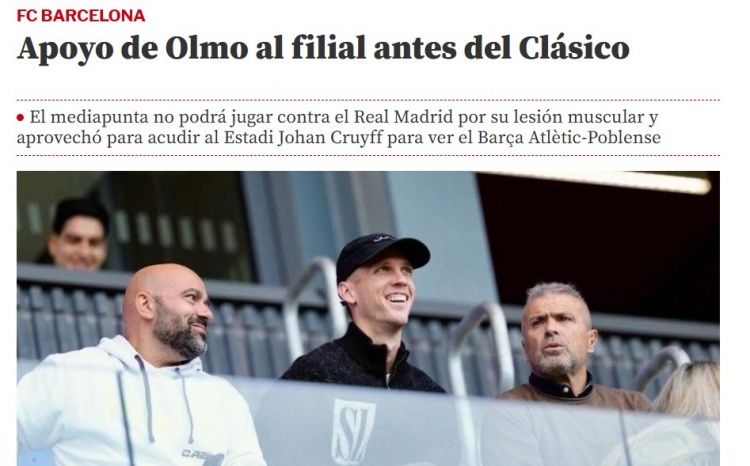他在看台上观看了赛事 全程,并与球迷进行了合影。报道指出,一线队球员观战B队赛事 已日益普遍,这对年轻球员是种激励。奥尔莫此前还曾现场支持过巴萨篮球赛 队对阵萨拉基利斯考纳斯的欧职业联赛 事,此举被视为他热爱巴萨的表现。