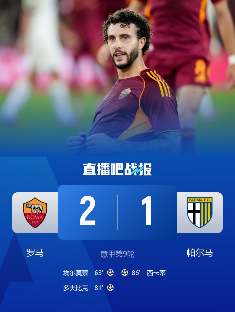 罗马本轮2-1击败帕尔马,埃尔莫索、多夫比克破门,罗马最近6轮拿下5胜!