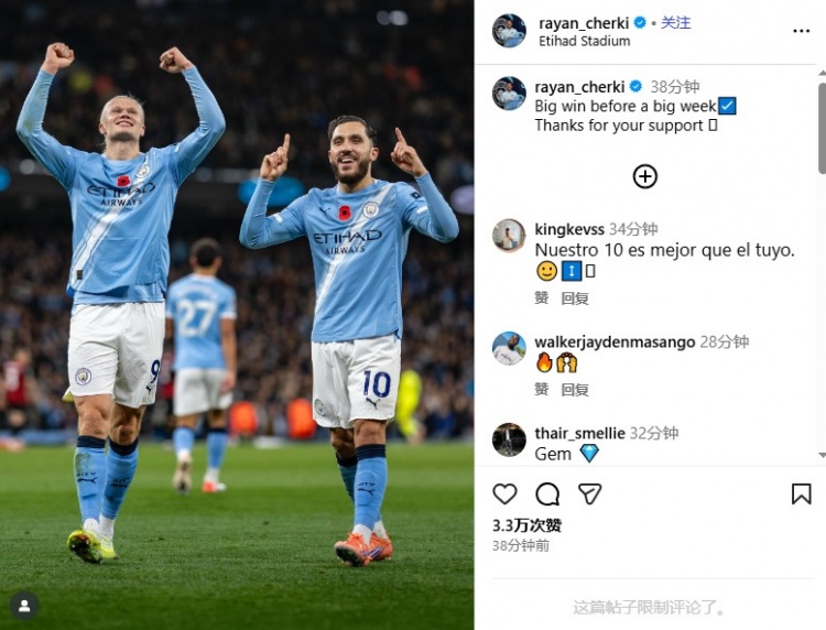 11月3日讯 2025-26赛季英超第10轮,曼城3-1战胜伯恩茅斯。赛后,本场比赛送出2次助攻的谢尔基在社交媒体庆祝球队获胜。