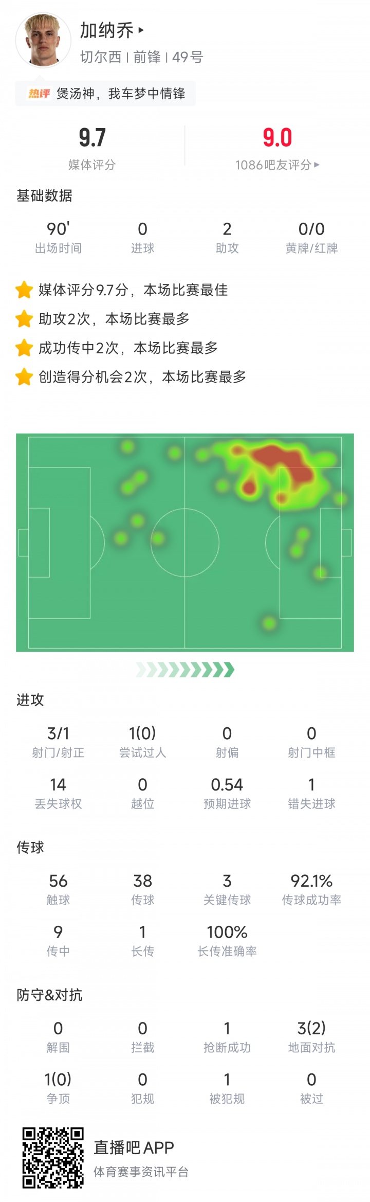 21岁的加纳乔刚加盟切尔西时适应得一般,表现并不算差但奈何前6场赛事 数据0球0助。好在加纳乔近期渐入佳境,坐稳杆位的他近4场赛事 2球2助,本场赛事 更是拿到9.7的超高评分,英超免费在线高清直播全场第1。他此役56次触球14次丢球权,传送球 38次成功率92.1%,3次关键传送球 2次助功 ,9次传中。