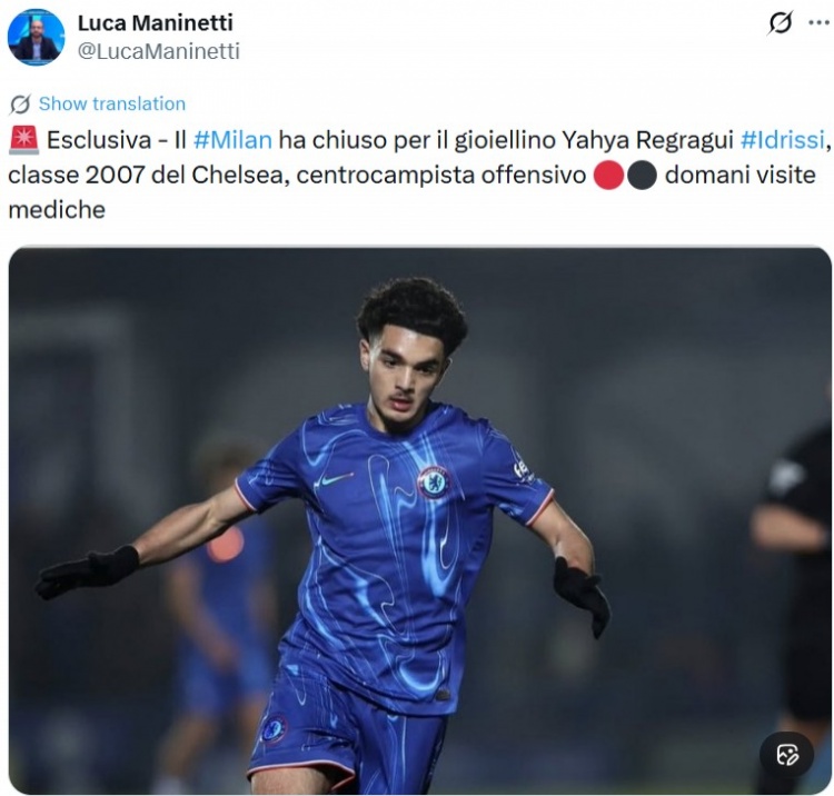 记者:AC米兰签下切尔西18岁中场球员伊德里西,明日将进行体检
