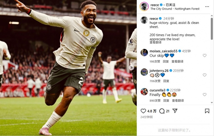 10月18日讯 今天,切尔西在英超3-0击败诺丁汉森林,里斯-詹姆斯赛后在Instagram发文,庆祝个人蓝军生涯200场里程碑。