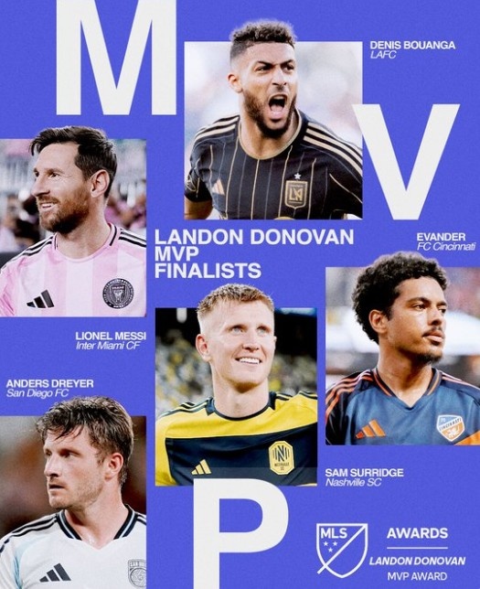 美职联公布了2025年年度最佳球员候选名单,梅西领衔,博安加在列。