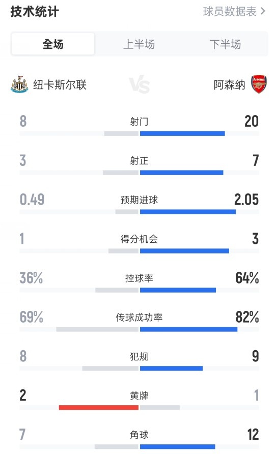 纽卡1-2阿森纳全场数据:射球 8-20,射正3-7,盘带时间 36%-64%