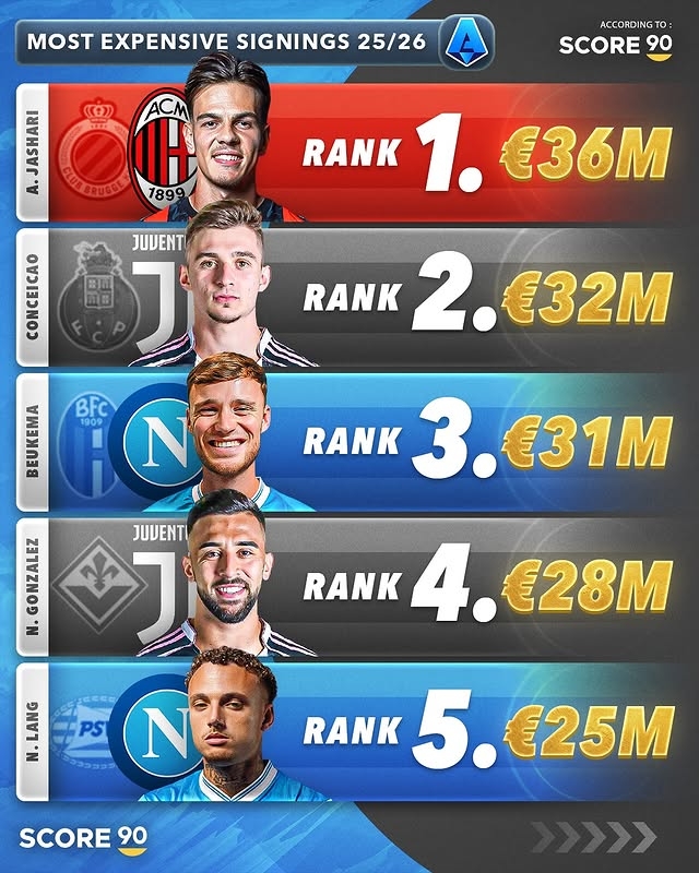 今夏意甲TOP5引援:米兰3600万欧签亚沙里居首 尤文&那不勒斯2席