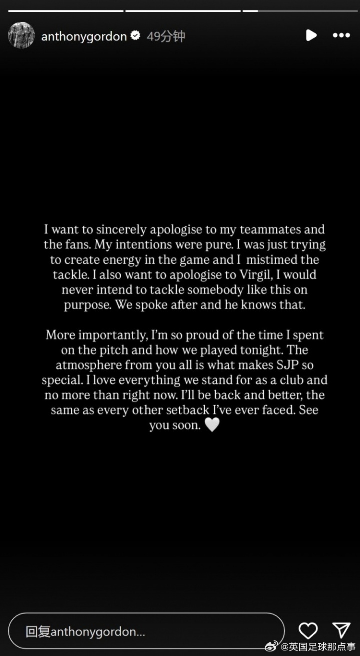 【不是故意的】纽卡斯尔联2-3利物浦的赛事 ,戈登铲倒范戴克,染红离场。赛后戈登在社媒上道歉: