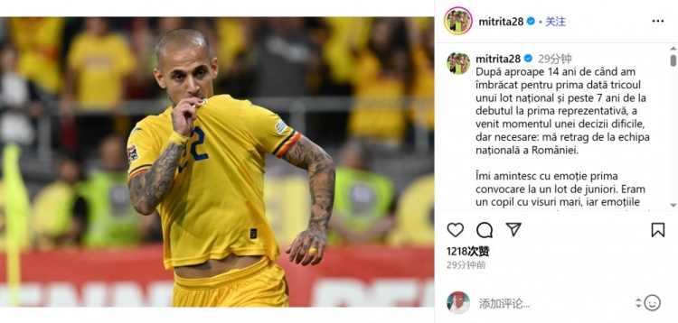 米特里策在社媒写道:“在首次穿上国家队运动活动 服 近14年、完成一线队首秀逾7年之后,我迎来了一个艰难却必要的决定:从罗马尼亚国家队退役。