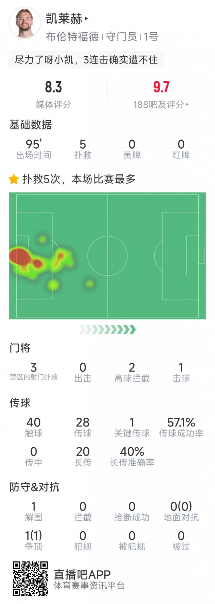 凯莱赫本场数据:5次成功扑救,1次扑点,评分8.3分