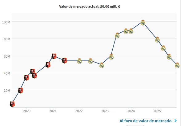 10月02日讯 今日德转更新西甲球员身价,22岁皇马中场球员卡马文加身价连续4次下跌,目前为5000万欧。