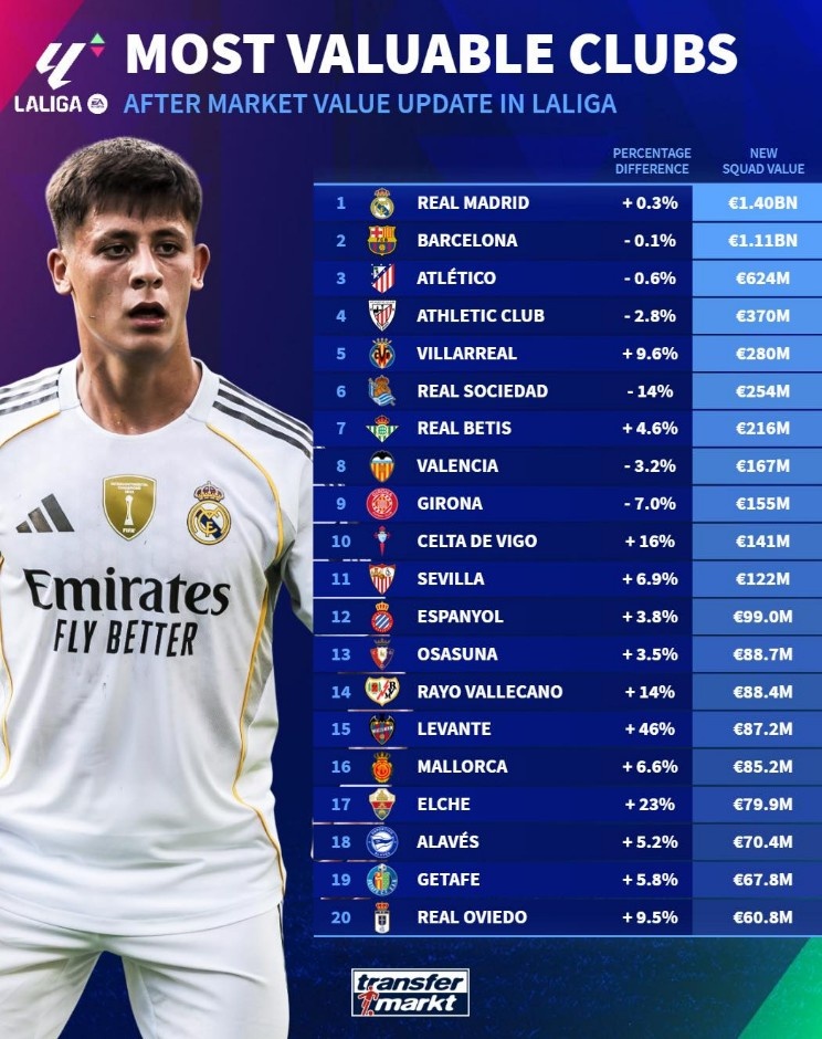 西甲球队身价榜:皇马14亿欧居首,巴萨11.1亿欧次席,马竞第三