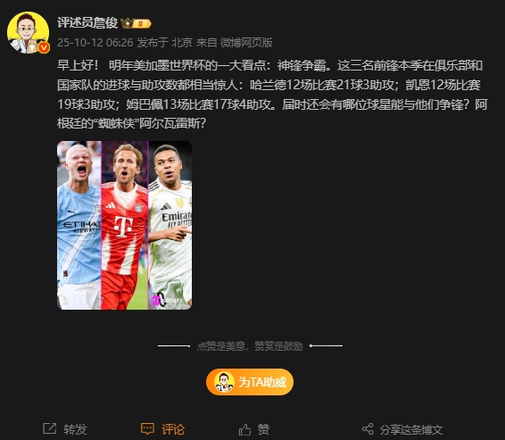 詹俊:早上好! 明年美加墨世界杯的一大看点:神锋争霸。这三名前锋本季在俱乐部和国家队的进球与助攻数都相当惊人:哈兰德12场比赛21球3助攻;凯恩12场比赛19球3助攻;姆巴佩13场比赛17球4助攻。届时还会有哪位球星能与他们争锋?阿根廷的“蜘蛛侠”阿尔瓦雷斯?