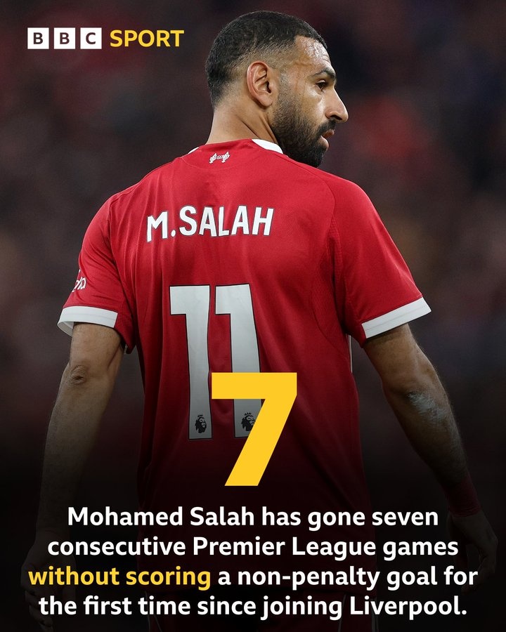 真老了?萨拉赫连续7场英超没有非十二码球得分 ,加盟利物浦以来首次