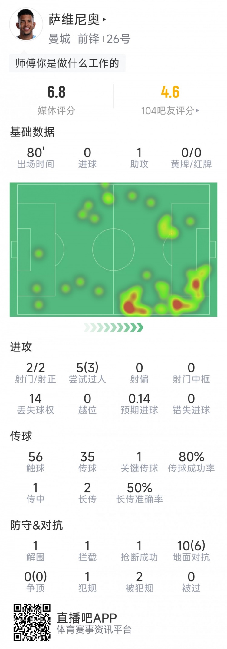 10月18日讯 在本轮英超曼城对阵埃弗顿的比赛中,萨维尼奥首发出场送出助攻,英超比赛在线观看无插件以下为他在本场数据: