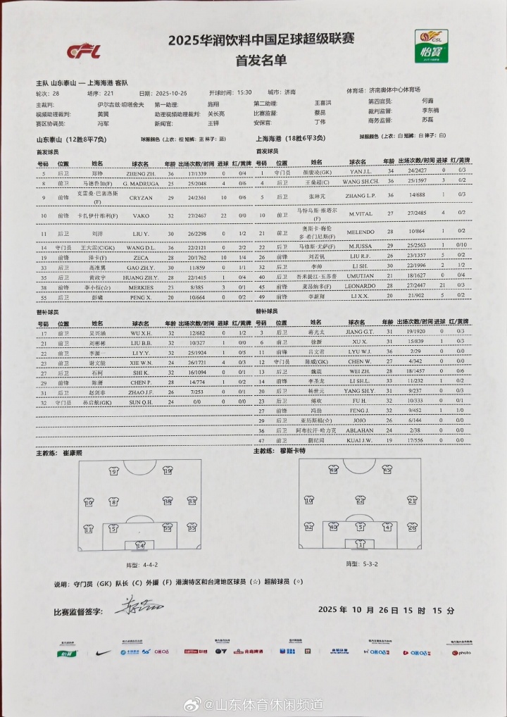 泰山战海港临场更换杆位!彭啸杆位,洛佩斯取消杆位