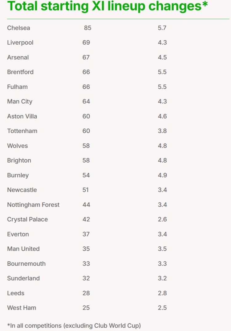 本赛季英超各队首发阵容调整次数:切尔西85次居首,红军枪手二三