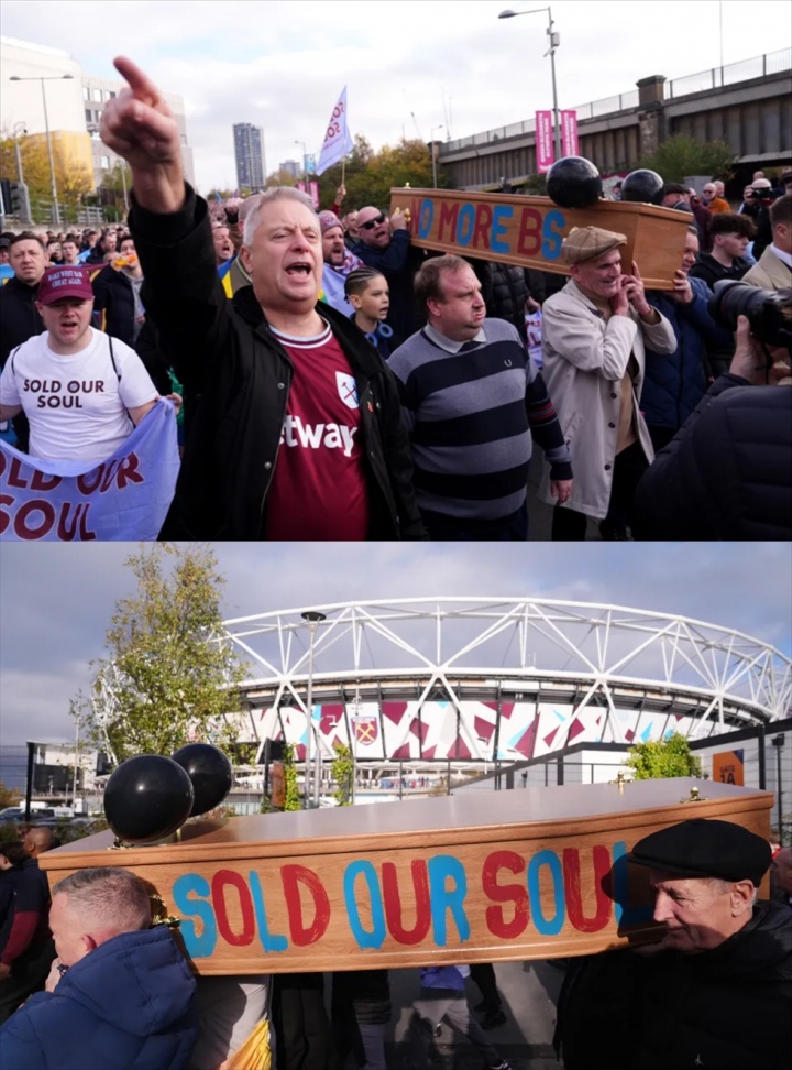 太阳报:不满俱乐部所有者,西汉姆联球迷抬棺抗议