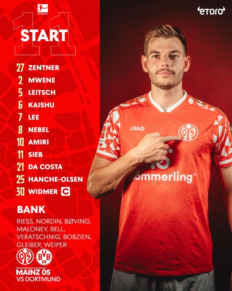 27-岑特纳、2-姆维尼、5-莱特施、6-佐野海舟、7-李在城、8-内布尔、10-阿米里、11-西耶布、21-达科斯塔、25-奥尔森、30-威德默