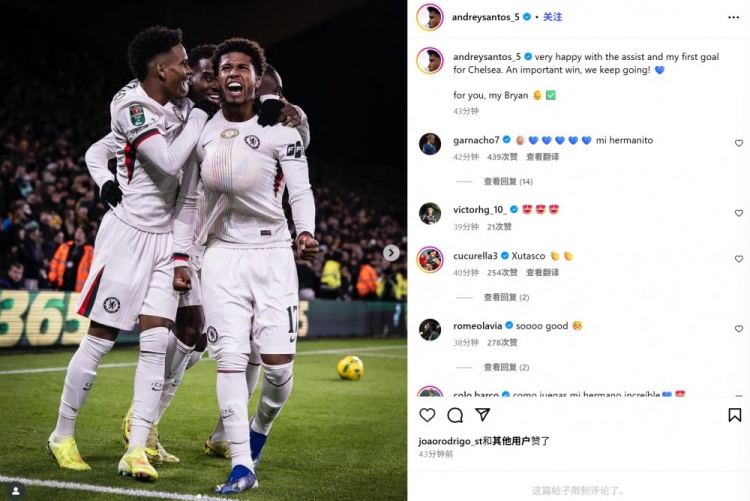 他也在赛后通过社媒晒出自己将皮球套在身前模仿孕妇的庆祝照,并配文:“非常开心能送出助攻,并且斩获我在切尔西的首粒进球。这是一场重要的胜利足球俱乐部最佳阵容,我们继续前进!💙献给我的布莱恩👶✅”