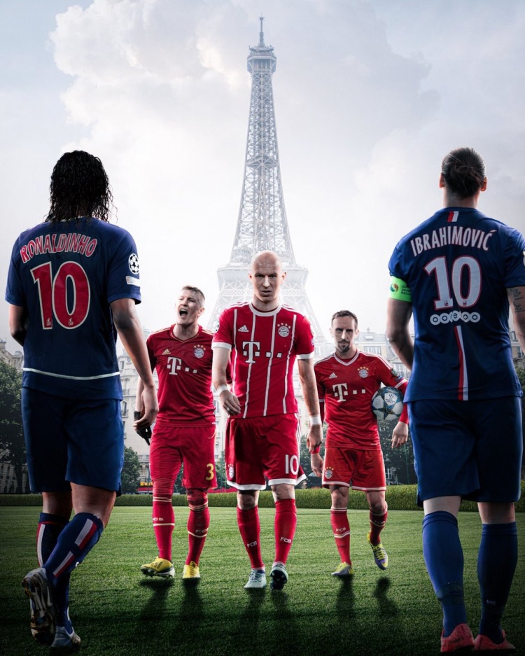 拜仁官方社媒发布海报为这场强强对话预热,拜仁方面罗本、里贝里、施魏因斯泰格出镜,24直播网巴黎则有小罗、伊布在列。