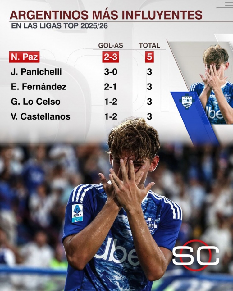 尼科-帕斯本赛季职业联赛 加入 5球,五大职业联赛 阿根廷球员最多