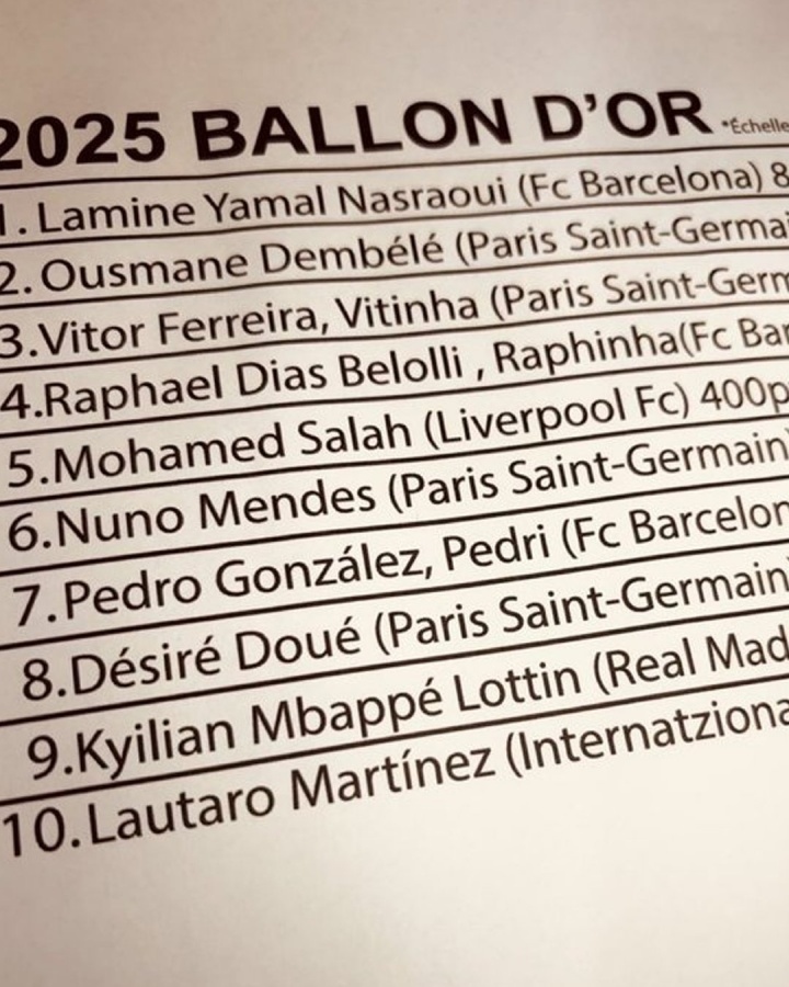 目前,英超直播网上已流出一份2025金球奖排名名单,亚马尔力压登贝莱获奖。
