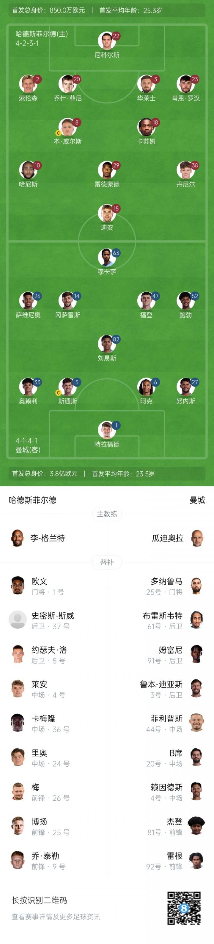 曼城后备 :25-多纳鲁马、3-鲁本-迪亚斯、61-凯登·布雷斯韦特、91-斯蒂芬·姆富尼、4-赖因德斯、20-B席、44-菲利普斯、99-雷根·赫斯基、98-杰登·赫斯基