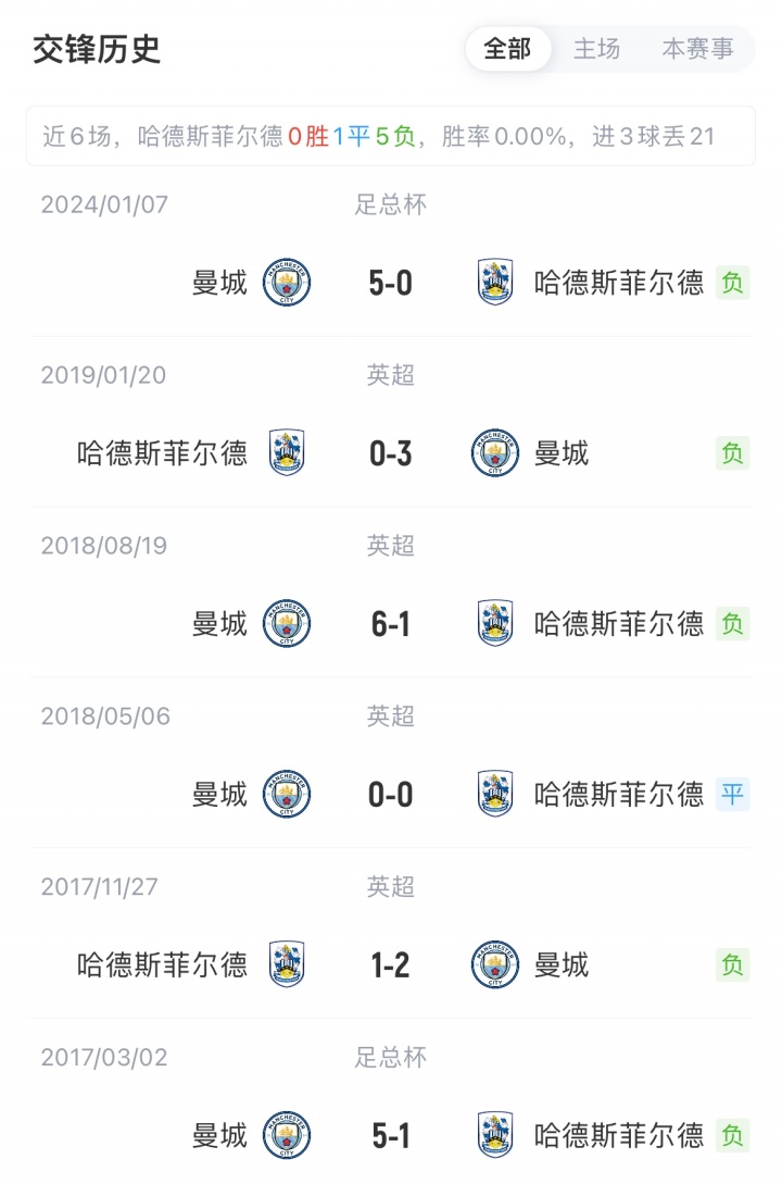 曼城职业联赛 2胜1平2负积7分暂位英超第9,英超免费在线高清直播近3场不败;哈德斯菲尔德职业联赛 5胜1平3负积16分暂位英甲第5,近2轮不胜。曼城历史7场对阵哈德斯菲尔德从未败绩(5胜2平)。