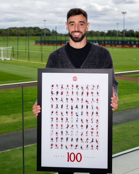 百球里程碑纪念!B费获曼联官方赠送的100球纪念框