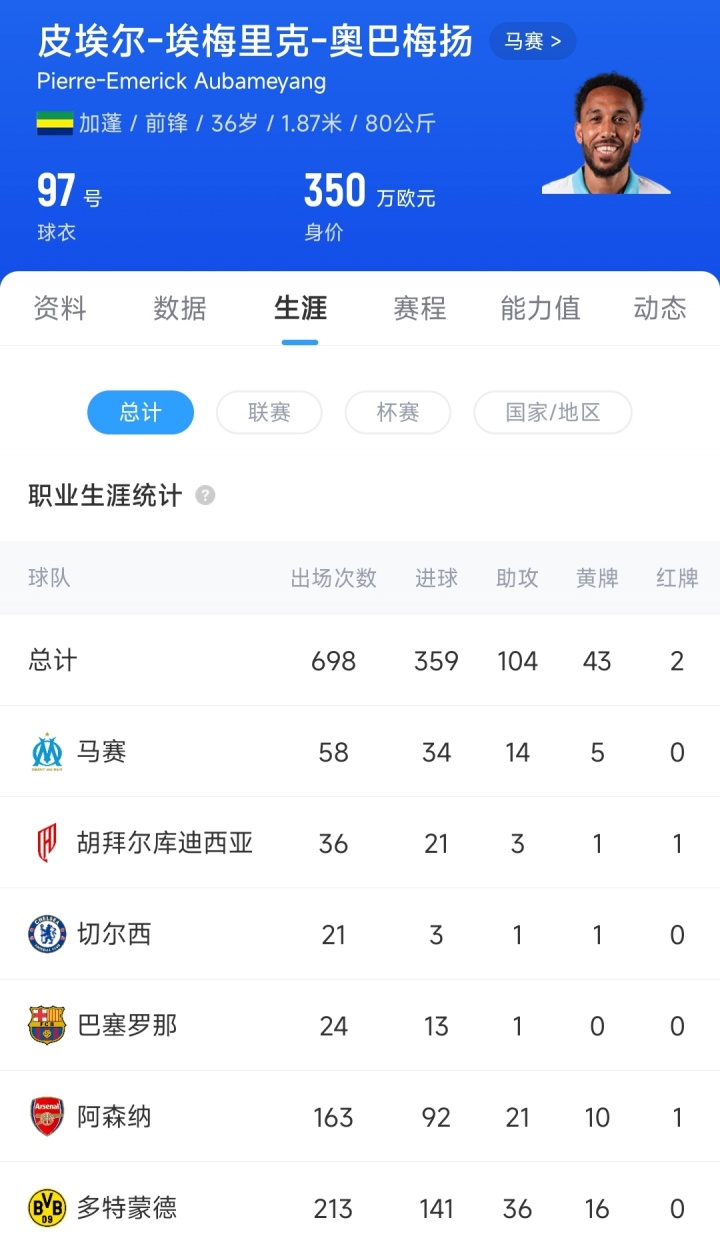 巅峰期 身价7500万欧!36岁奥巴梅扬欧冠1射2传,回归马赛7场4球2助