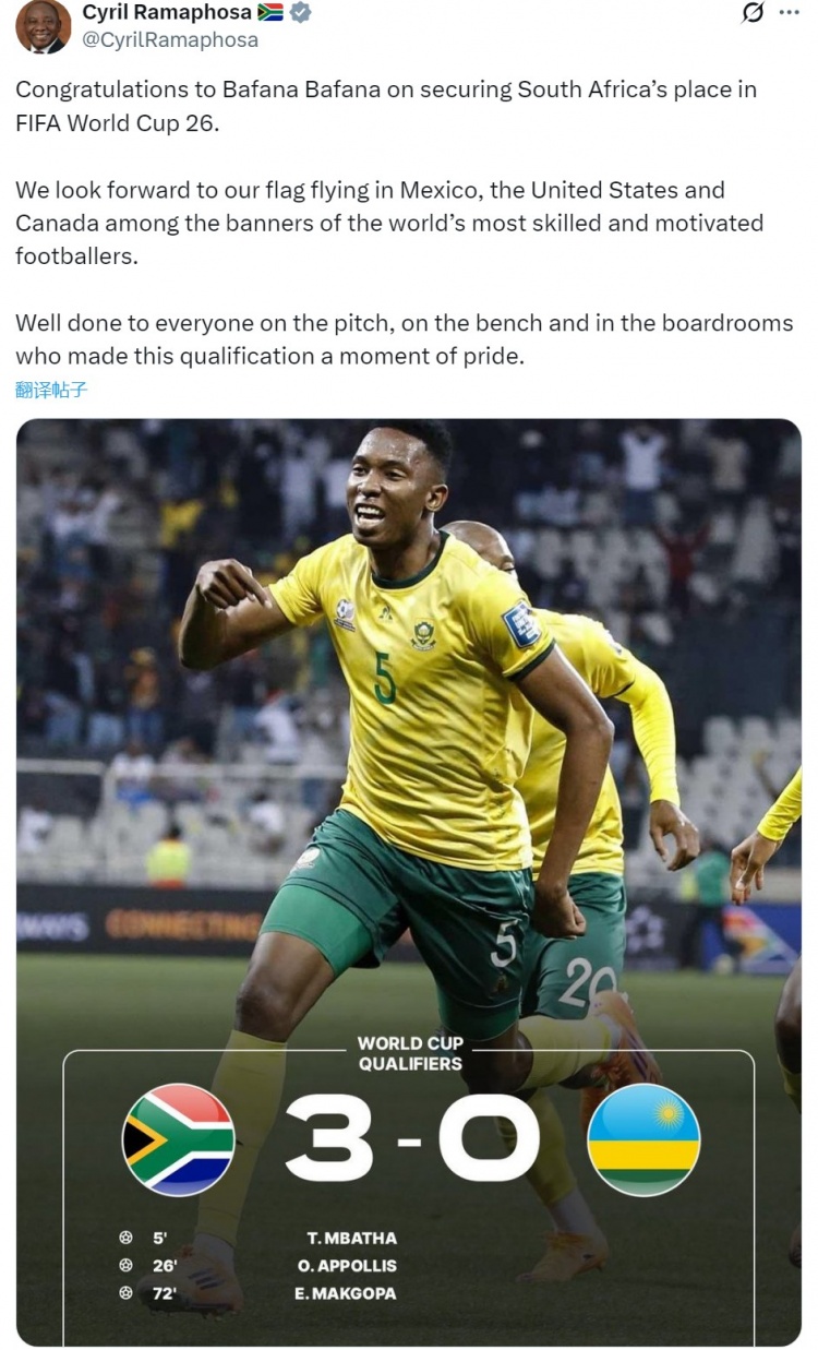 南非总统拉马福萨连发两条推文,对南非队表示祝福,首条推文写道:“我们进军2026年世界杯赛 !祝贺南非国家队全体成员,英超免费在线高清直播整个南非将一如既往地支持你们,一路同行。”