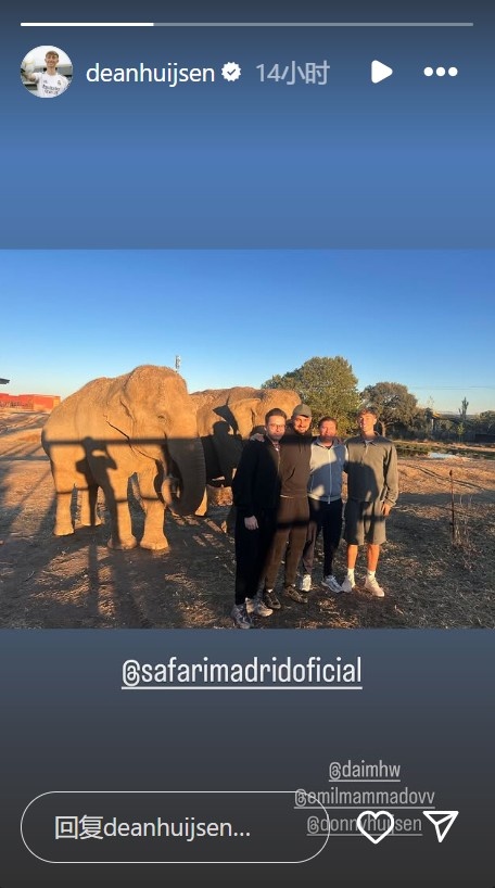 当地时间周一,皇马后场球员赫伊森与亲友前往马德里野生动物园游览,英超直播他在个人社媒晒出与大象的合照。