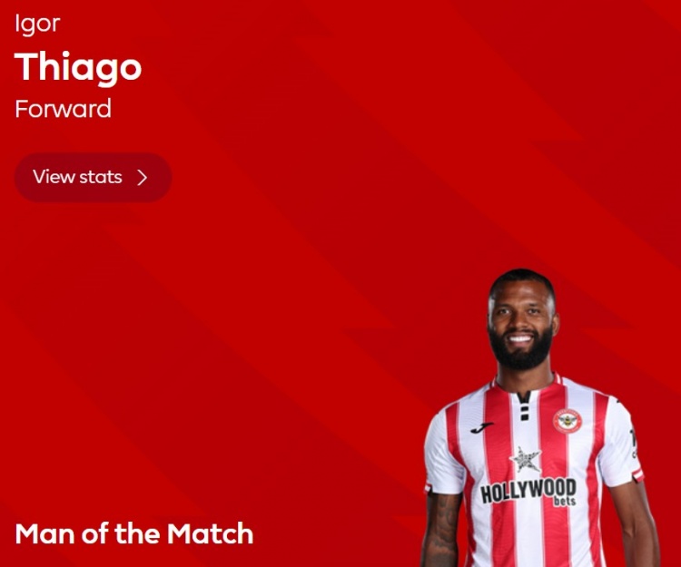 连进两球,英超官方:伊戈尔当选布伦特福德3-1纽卡全场最佳
