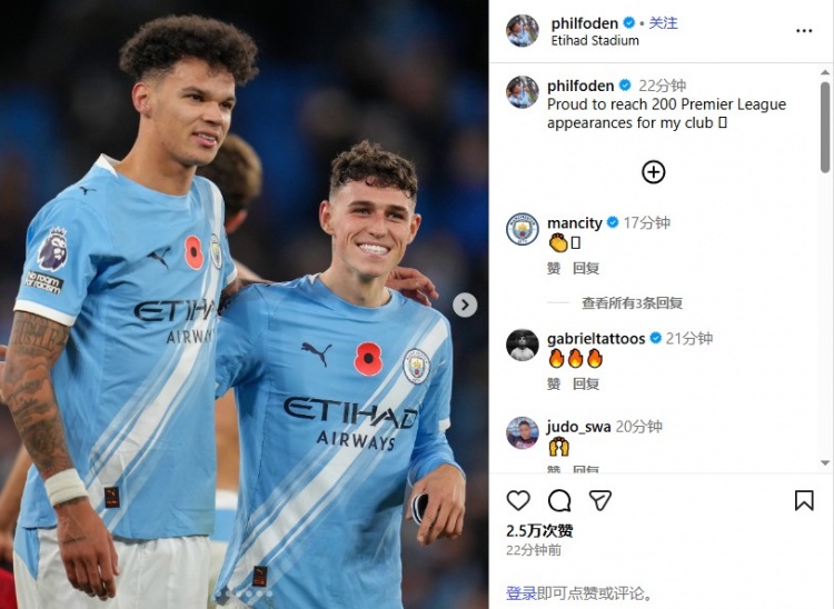福登社媒晒图庆祝里程碑:很荣幸代表我的俱乐部在英超出场200次